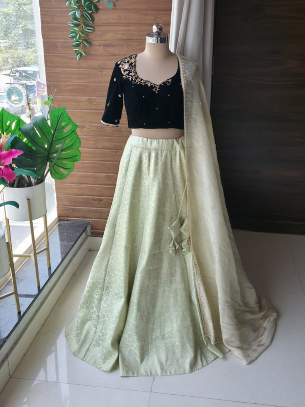 An elegant lehenga set featuring a classic black embroidered blouse, paired with a soft flared skirt and a graceful dupatta—perfect for festive occasions.