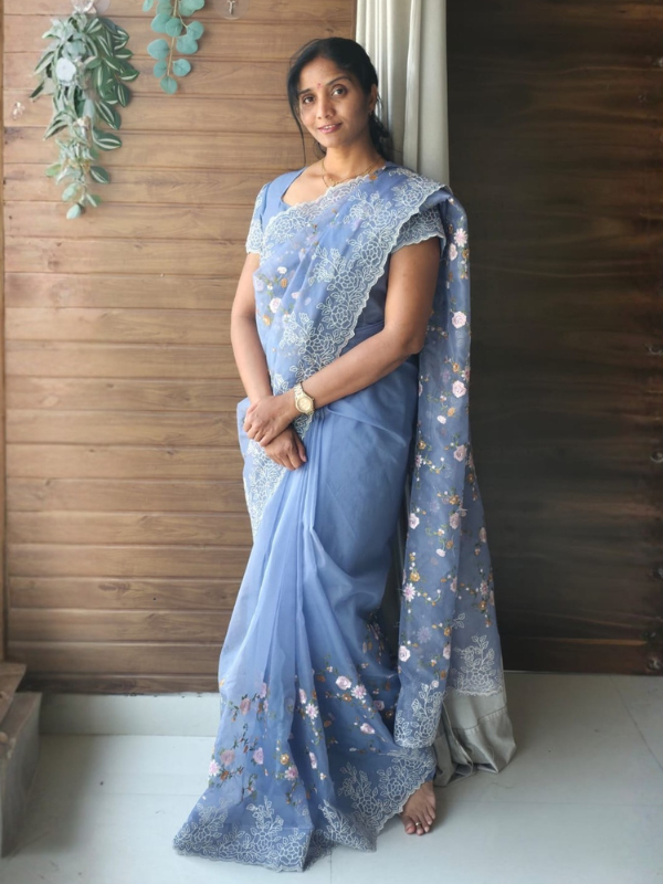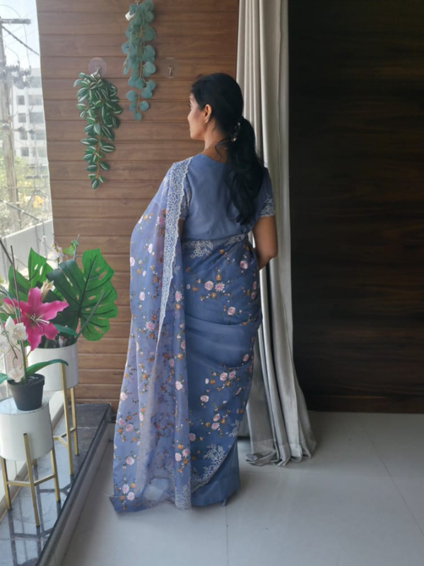 Step into effortless elegance with this beautifully crafted blouse-attached saree, designed for modern women who value both style and comfort. Made in a soft, breathable fabric, this saree features a calming blue hue enhanced with intricate floral embroidery and fine lace borders that add a touch of sophistication.
