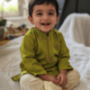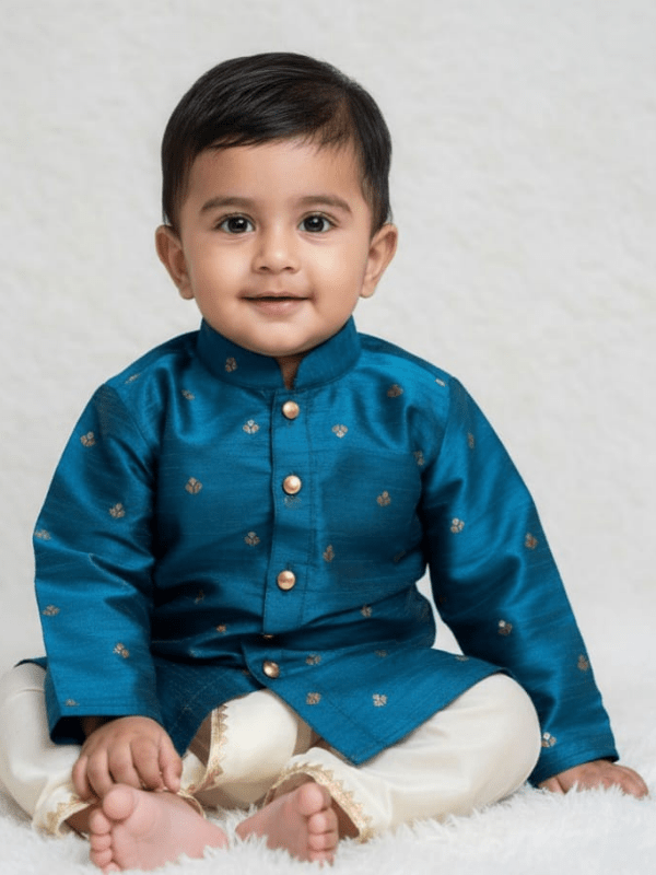 Dress your little one in traditional elegance with this Raw Silk Kurta and Silk Doti set. Soft, comfortable, and perfect for festive occasions, weddings, and family celebrations for boys aged 1–3 years.