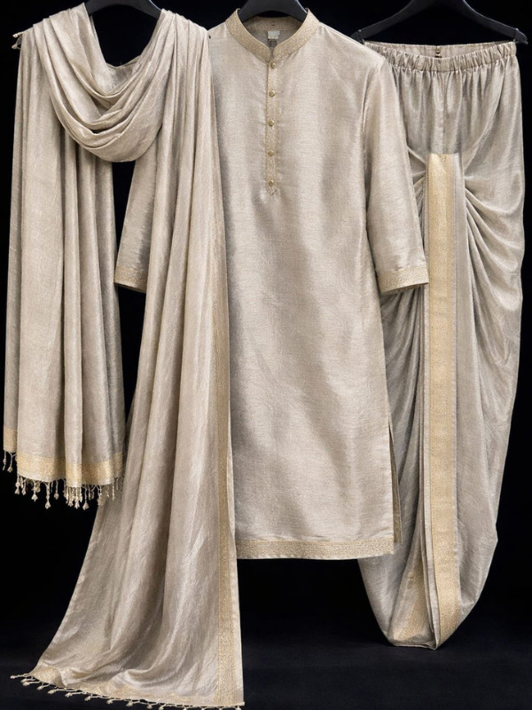 Step into timeless elegance with this beautifully crafted kurta set made from luxurious Jiraf tissue fabric. Designed for those who appreciate understated sophistication, this ensemble showcases a soft shimmer that enhances its regal appeal.