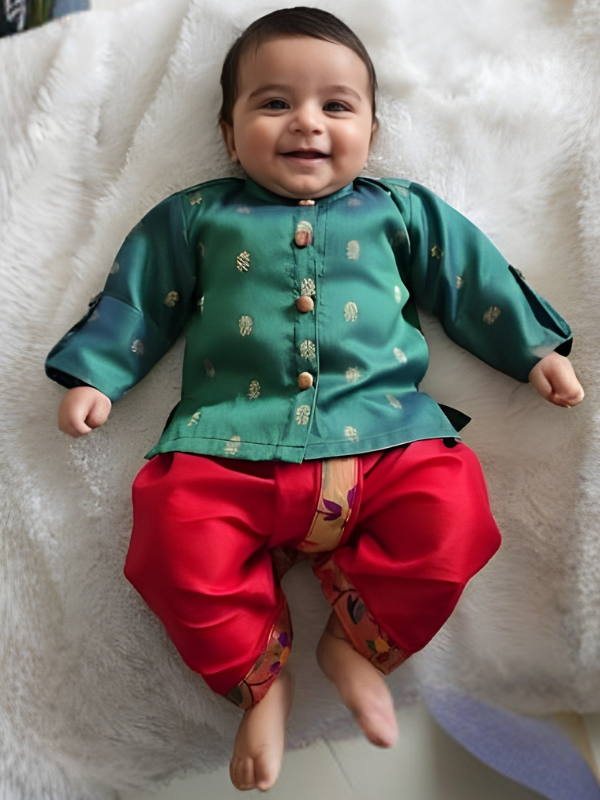 The traditional design adds a cultural touch, making it ideal for festivals, naming ceremonies, weddings, photoshoots, and family celebrations. Lightweight and breathable, it keeps your baby comfortable throughout the day.