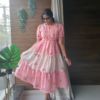 The dress features a comfortable round neckline and stylish puff sleeves that enhance its graceful silhouette. The fitted bodice flows into a beautifully designed tiered layered skirt, highlighted with a soft contrast panel that adds volume and movement to the outfit.